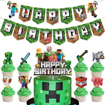 Minecraft decoraciones para decoración de fiesta de Feliz Cumpleaños conjunto papel Pixel Wars Banner pastel postre Topper Fondo tela